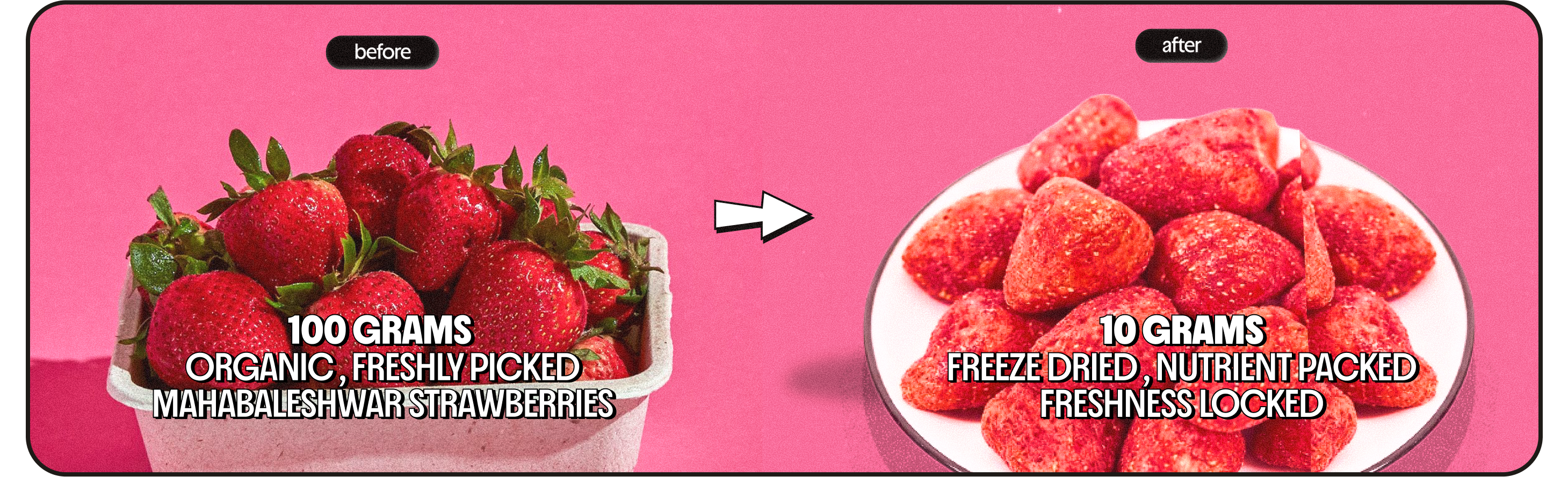 Freeze-drying is a gentle process where fresh fruits are frozen and the water is removed at low temperatures. This helps retain the fruit’s natural taste, texture, and nutrient, without using heat.